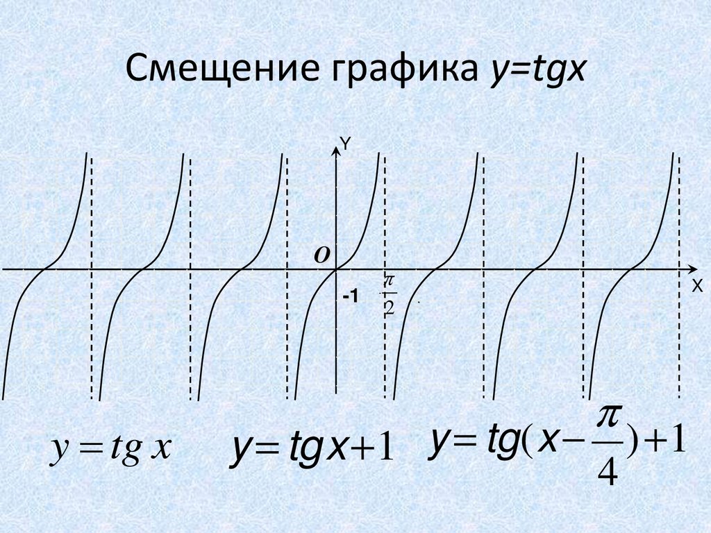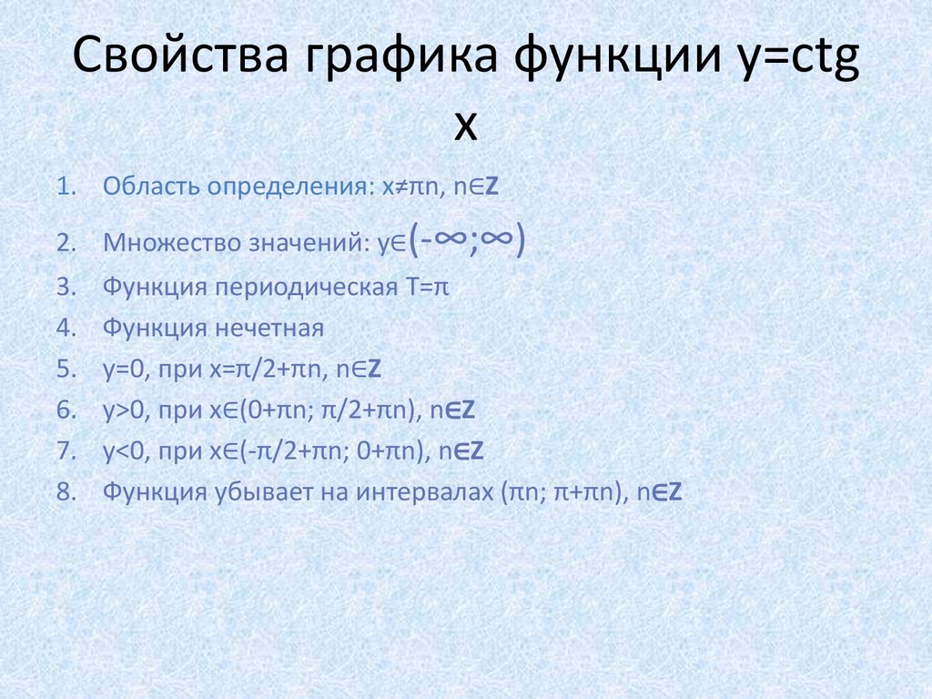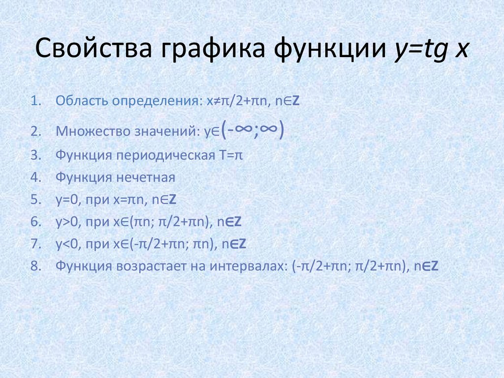 Свойства графика функции y=tg x1. Область определения: x≠π/2+πn, n∈Z