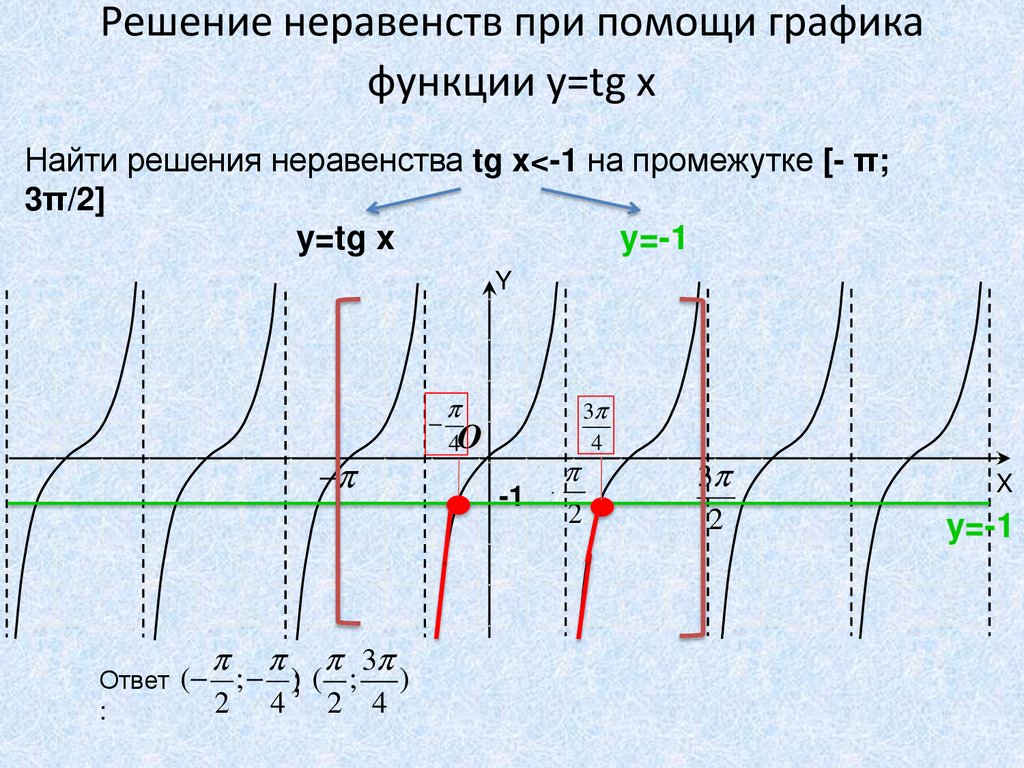 Найти решения неравенства tg x<-1 на промежутке [- π;