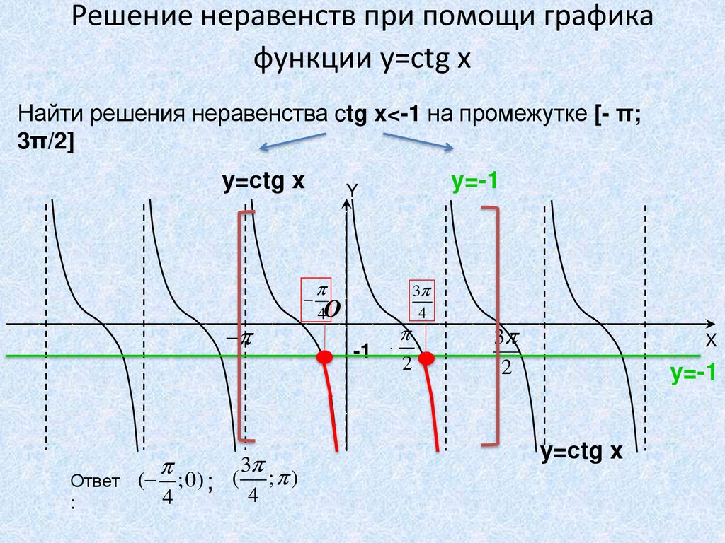 Найти решения неравенства ctg x<-1 на промежутке [- π;