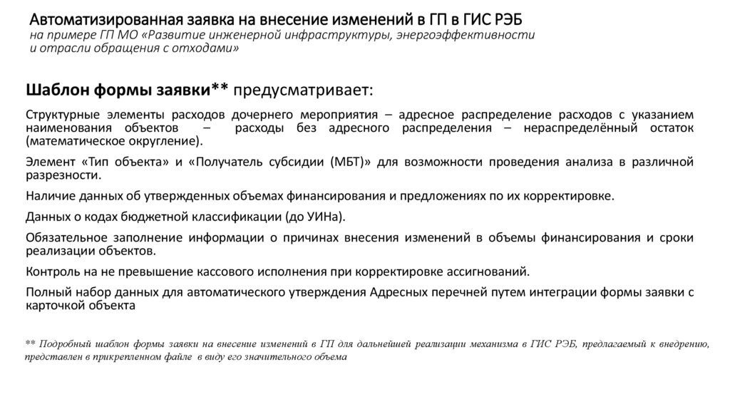 ** Подробный шаблон формы заявки на внесение изменений в ГП для дальнейшей реализации механизма в ГИС РЭБ, предлагаемый к внедрению,