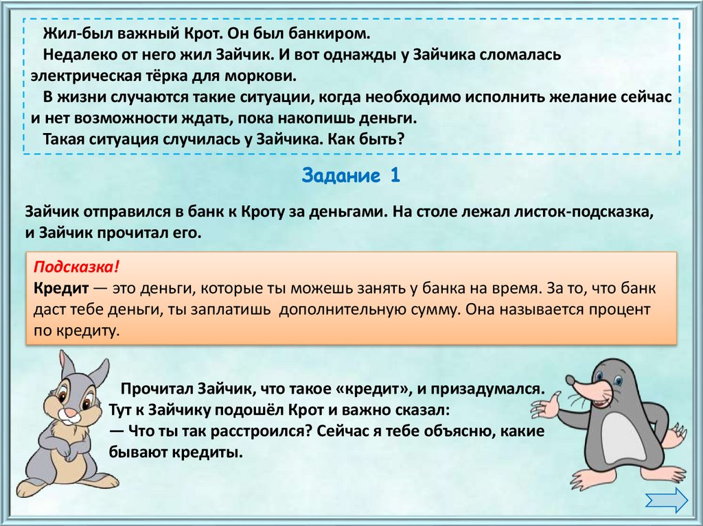 Крот предложил Зайцу подумать, какой кредит ему нужен.