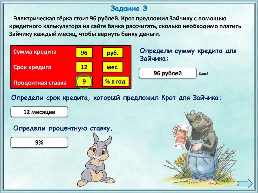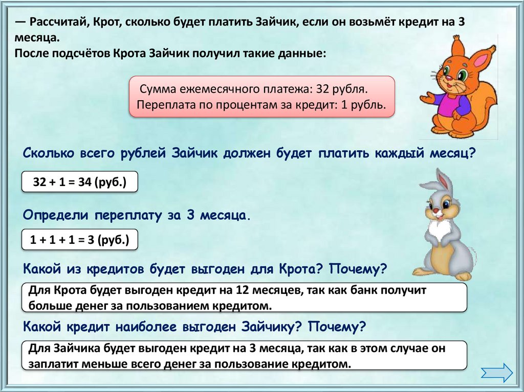 — Рассчитай, Крот, сколько будет платить Зайчик, если он возьмёт кредит на 3месяца.