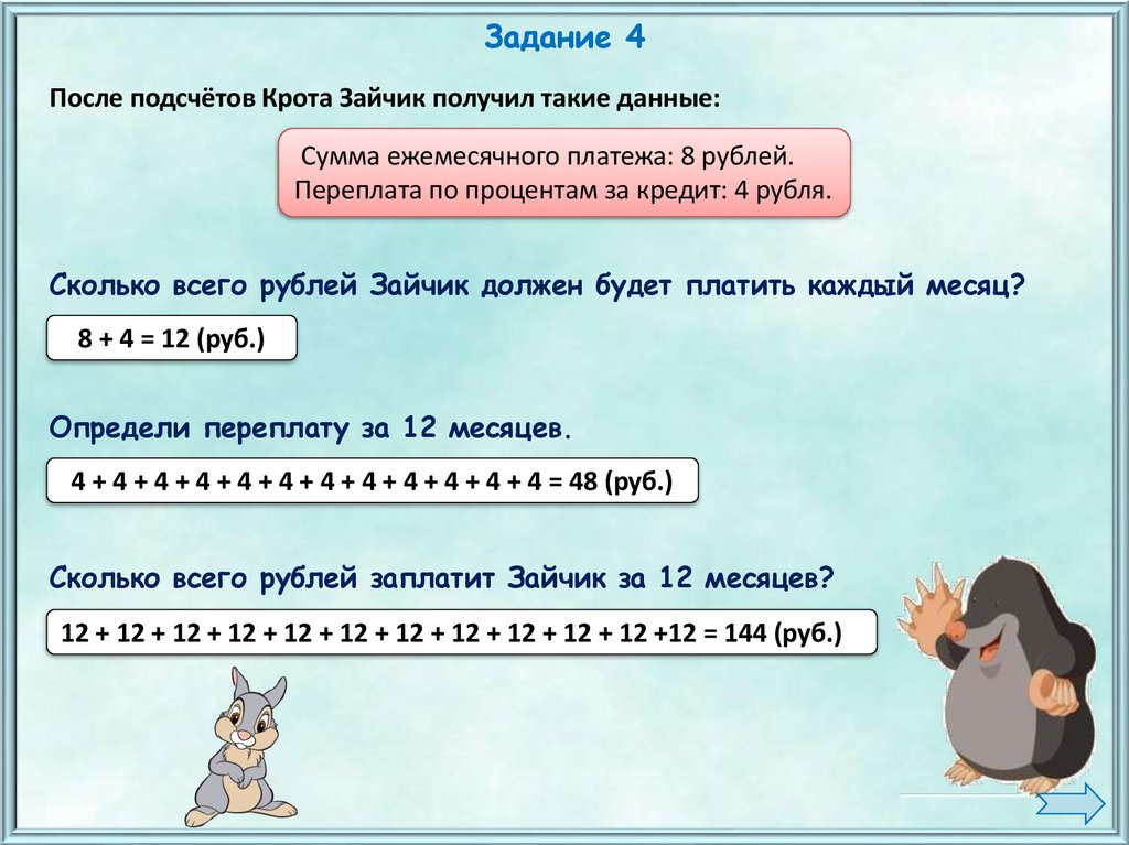 — Рассчитай, Крот, сколько будет платить Зайчик, если он возьмёт кредит на 6
