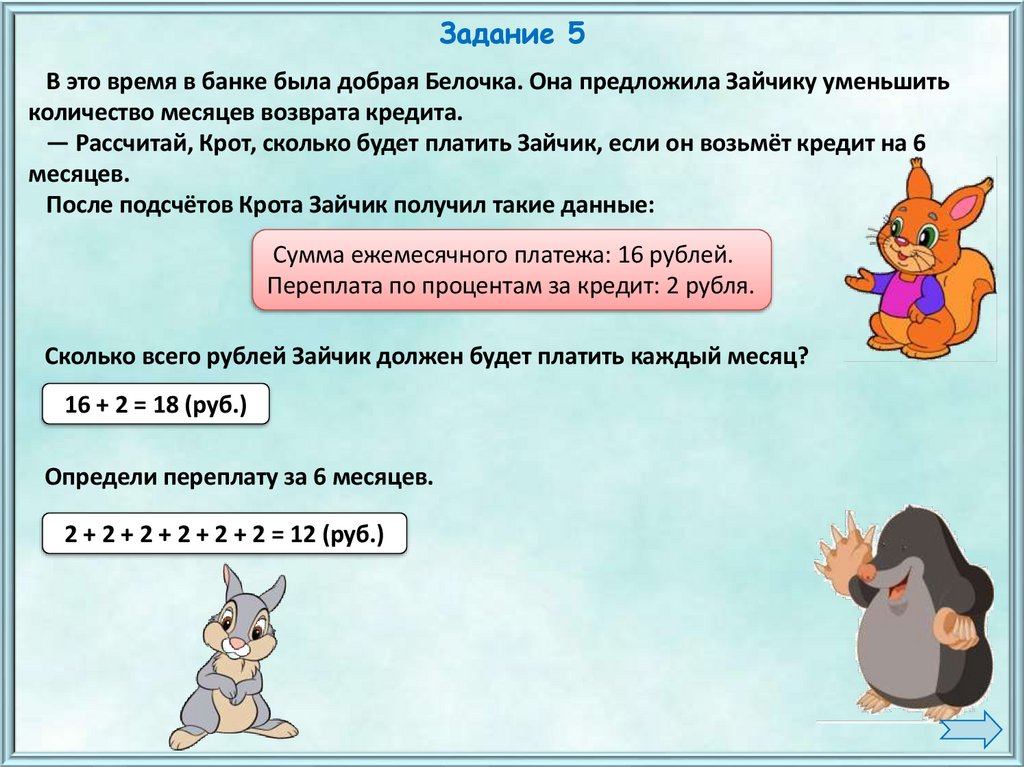 Задание 5В это время в банке была добрая Белочка. Она предложила Зайчику уменьшить
