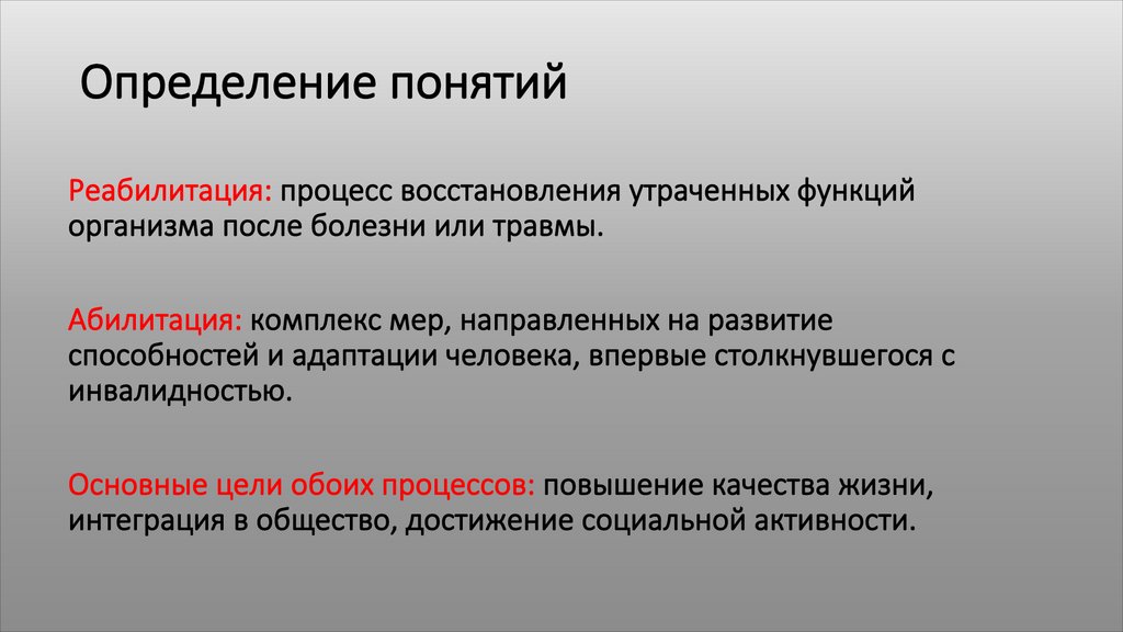Определение понятийРеабилитация: процесс восстановления утраченных функций