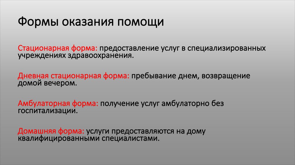 Формы оказания помощиСтационарная форма: предоставление услуг в специализированных