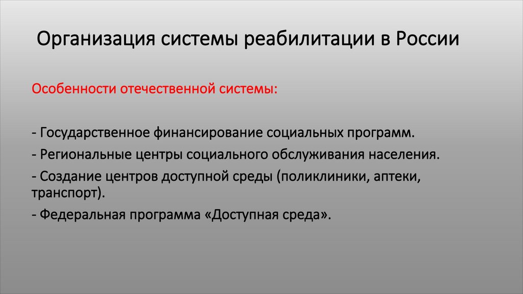 Организация системы реабилитации в РоссииОсобенности отечественной системы: