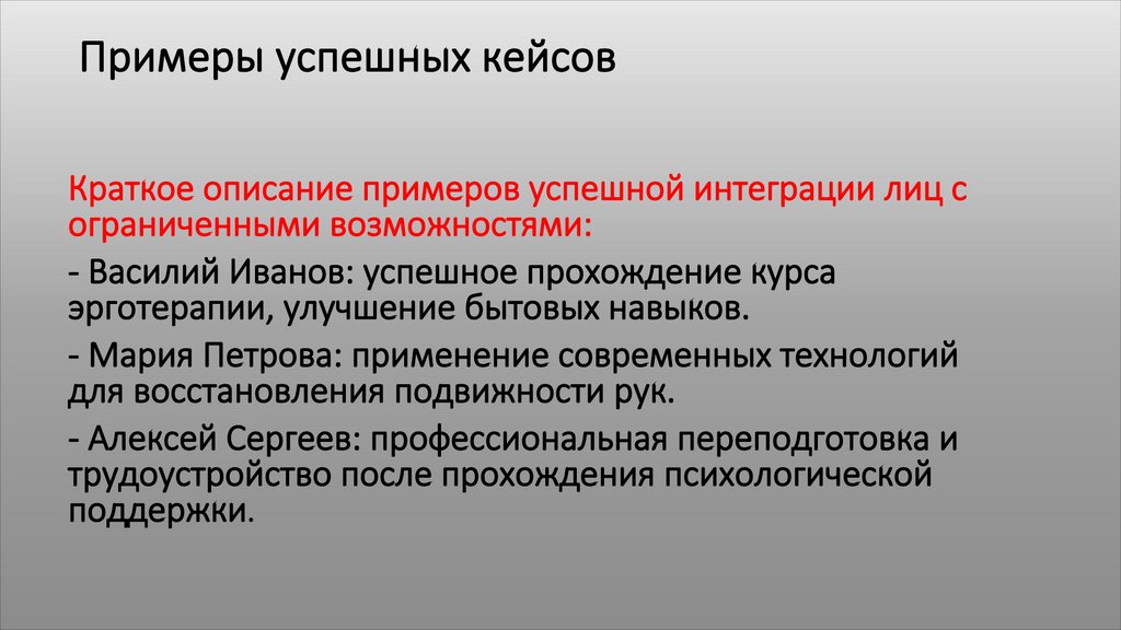 Примеры успешных кейсовКраткое описание примеров успешной интеграции лиц с