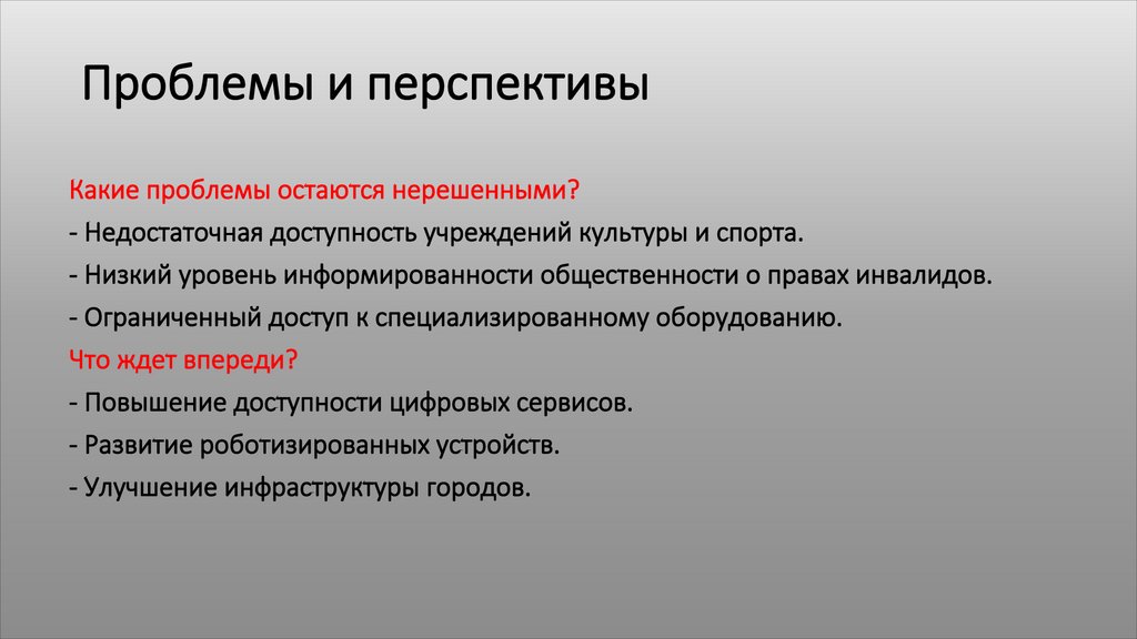 - Низкий уровень информированности общественности о правах инвалидов.