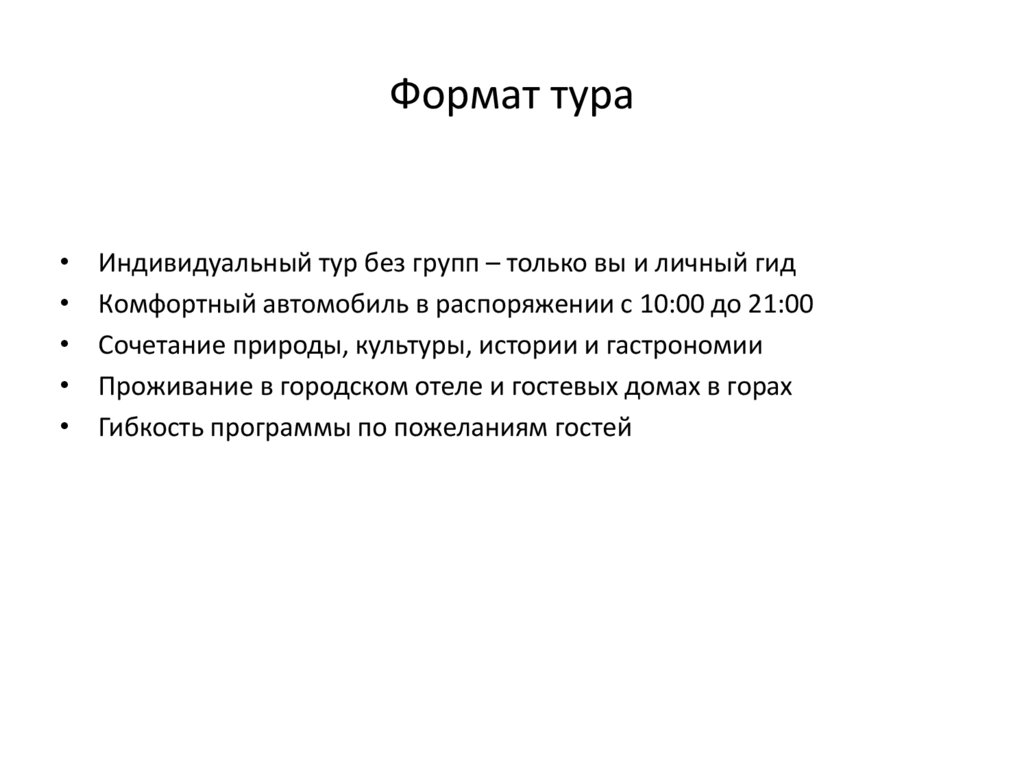 Формат тураИндивидуальный тур без групп – только вы и личный гид