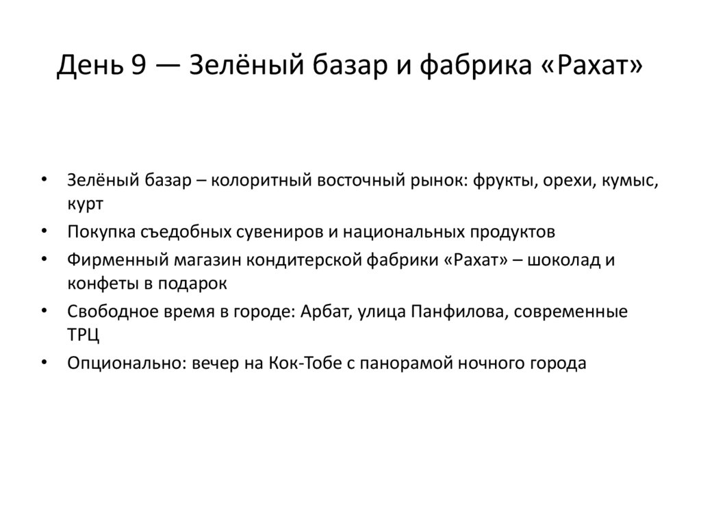 День 9 — Зелёный базар и фабрика «Рахат»• Зелёный базар – колоритный восточный рынок: фрукты, орехи, кумыс,