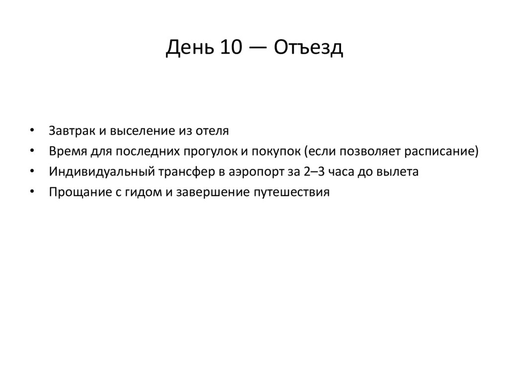 День 10 — ОтъездЗавтрак и выселение из отеля