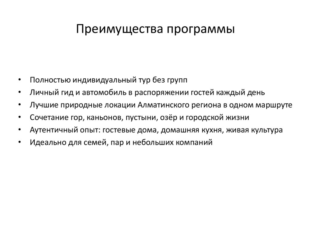 Преимущества программыПолностью индивидуальный тур без групп