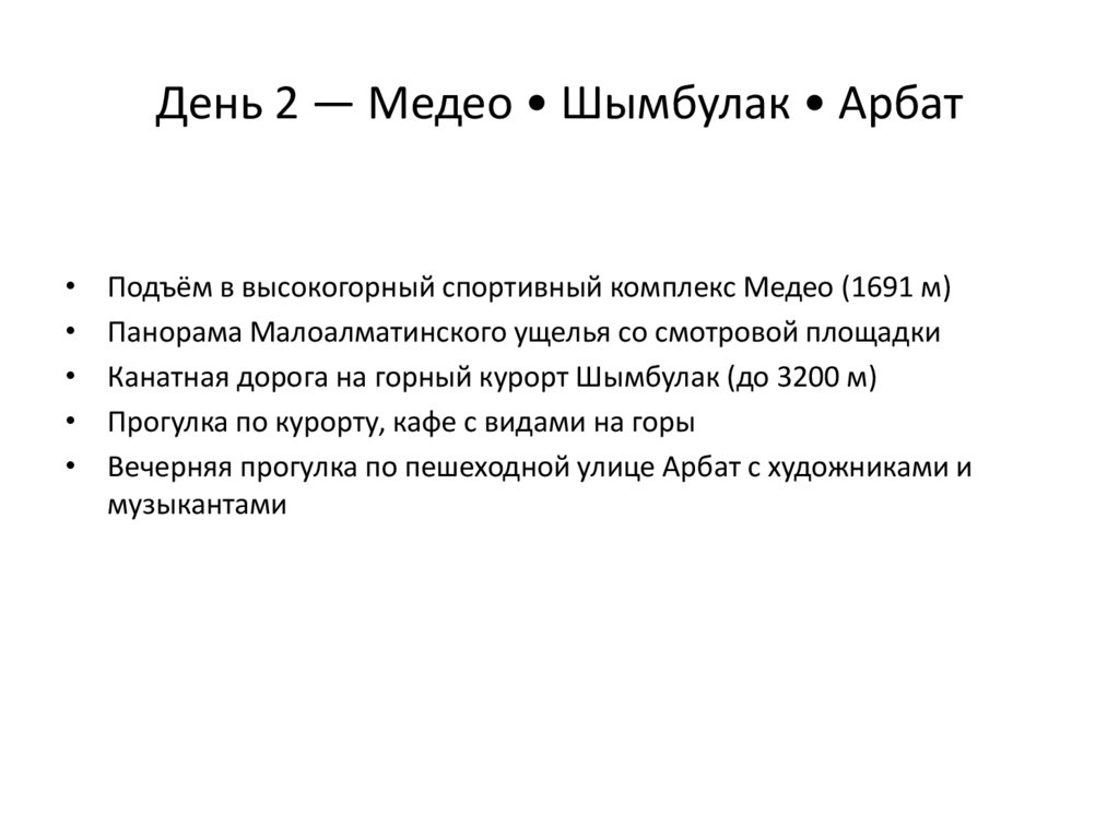 День 2 — Медео • Шымбулак • АрбатПодъём в высокогорный спортивный комплекс Медео (1691 м)