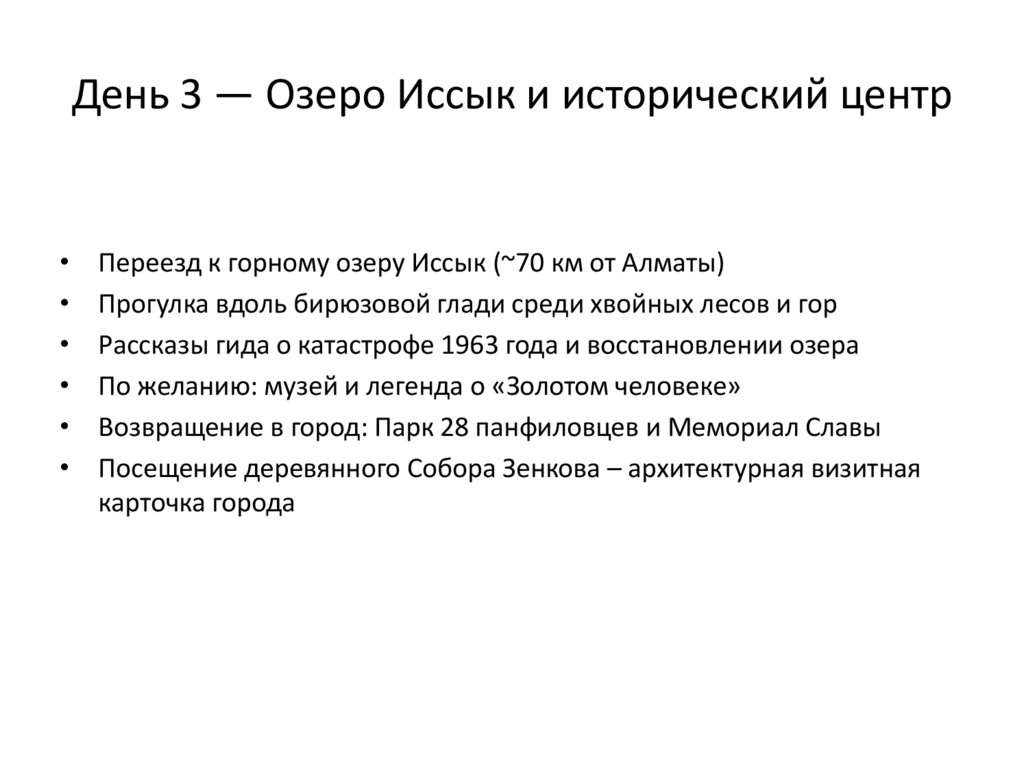 День 3 — Озеро Иссык и исторический центрПереезд к горному озеру Иссык (~70 км от Алматы)
