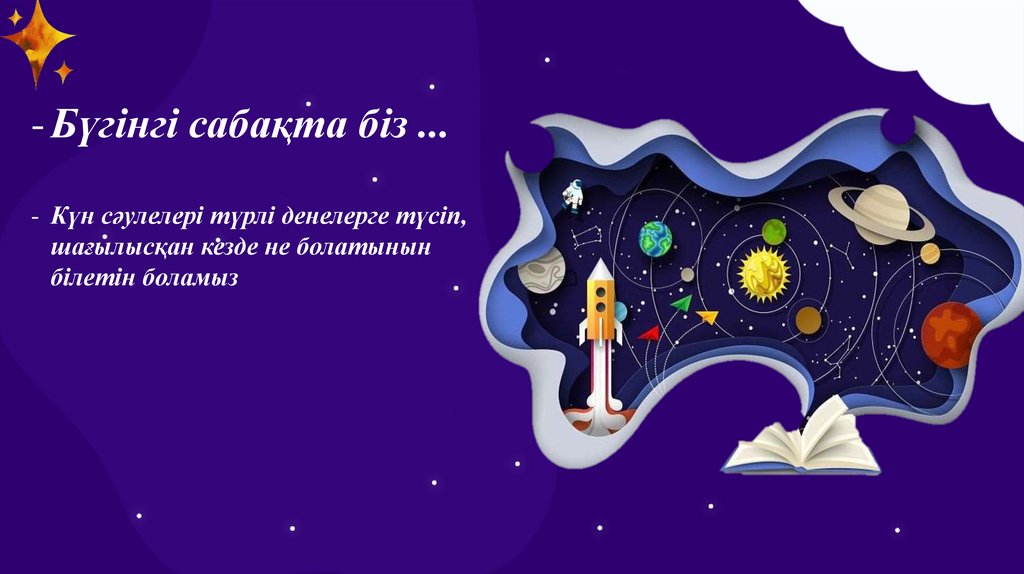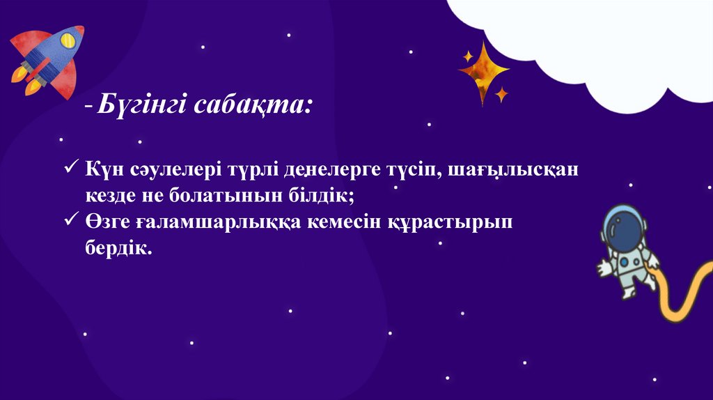 - Бүгінгі сабақта біз ...- Күн сәулелері түрлі денелерге түсіп,