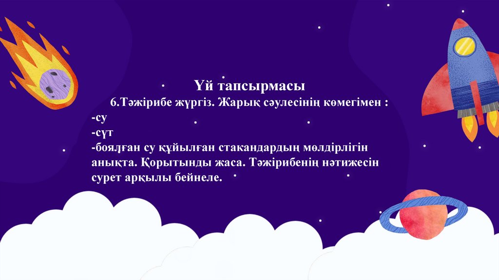 Үй тапсырмасы6.Тәжірибе жүргіз. Жарық сәулесінің көмегімен :