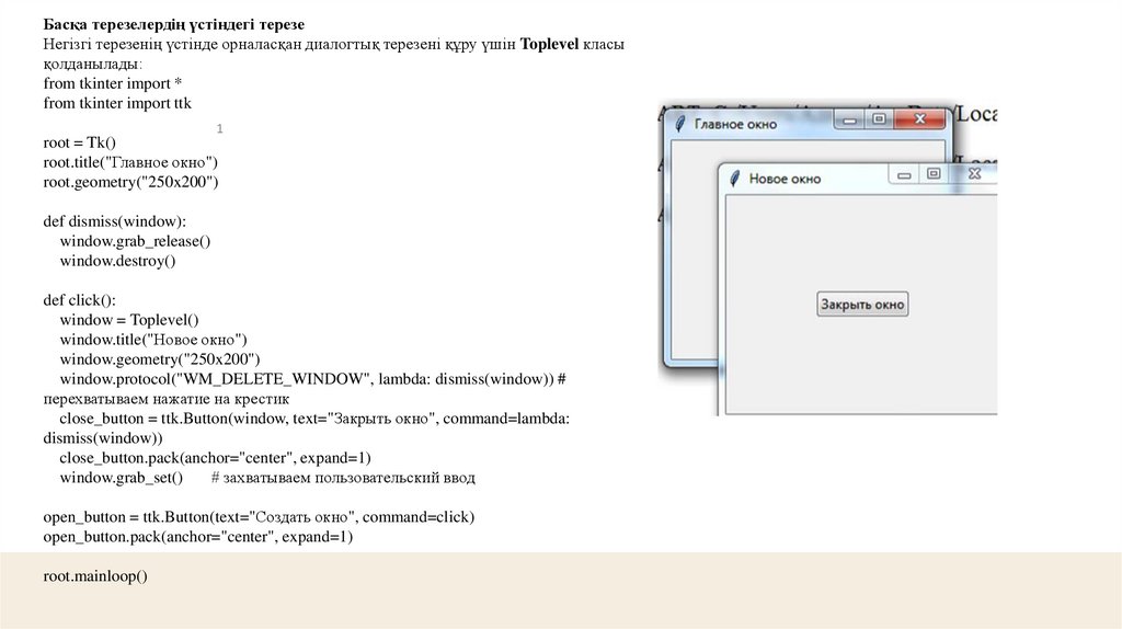 Басқа терезелердің үстіндегі терезеНегізгі терезенің үстінде орналасқан диалогтық терезені құру үшін Toplevel класы