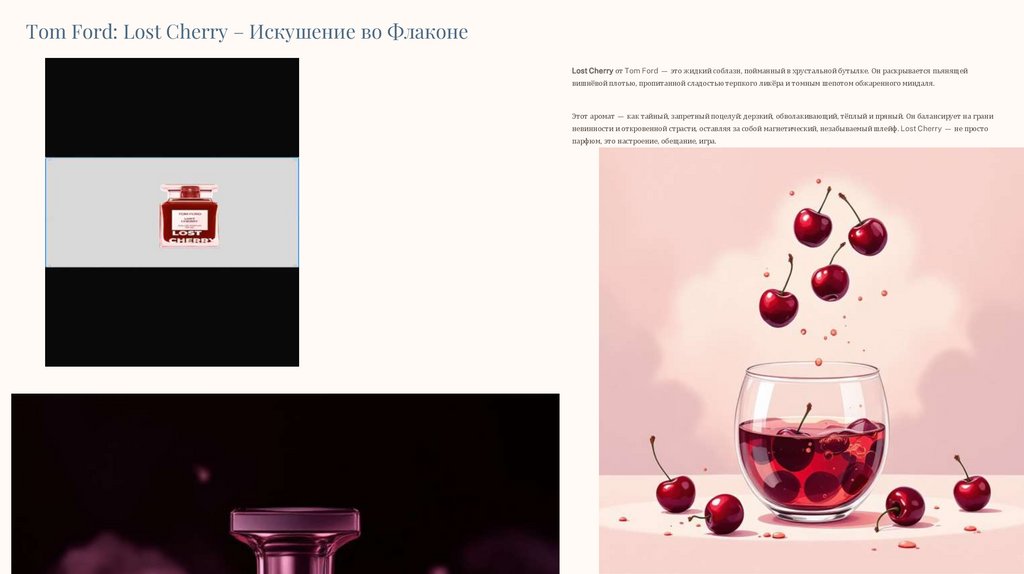 Tom Ford: Lost Cherry – Искушение во ФлаконеLost Cherry от Tom Ford — это жидкий соблазн, пойманный в хрустальной бутылке. Он раскрывается пьянящей
