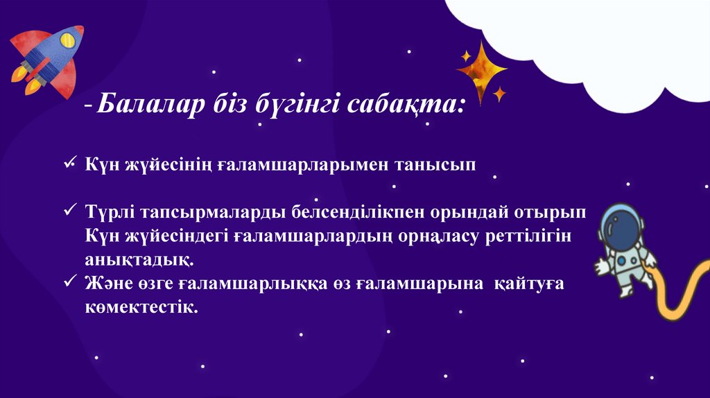 - Балалар біз бүгінгі сабақта:Күн жүйесінің ғаламшарларымен танысып