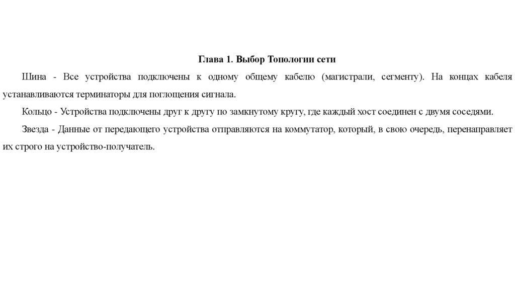 Глава 1. Выбор Топологии сетиШина - Все устройства подключены к одному общему кабелю (магистрали, сегменту). На концах кабеля
