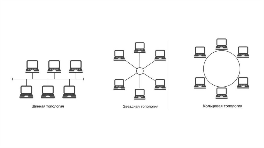 Кольцо - Устройства подключены друг к другу по замкнутому кругу, где каждый хост соединен с двумя соседями.