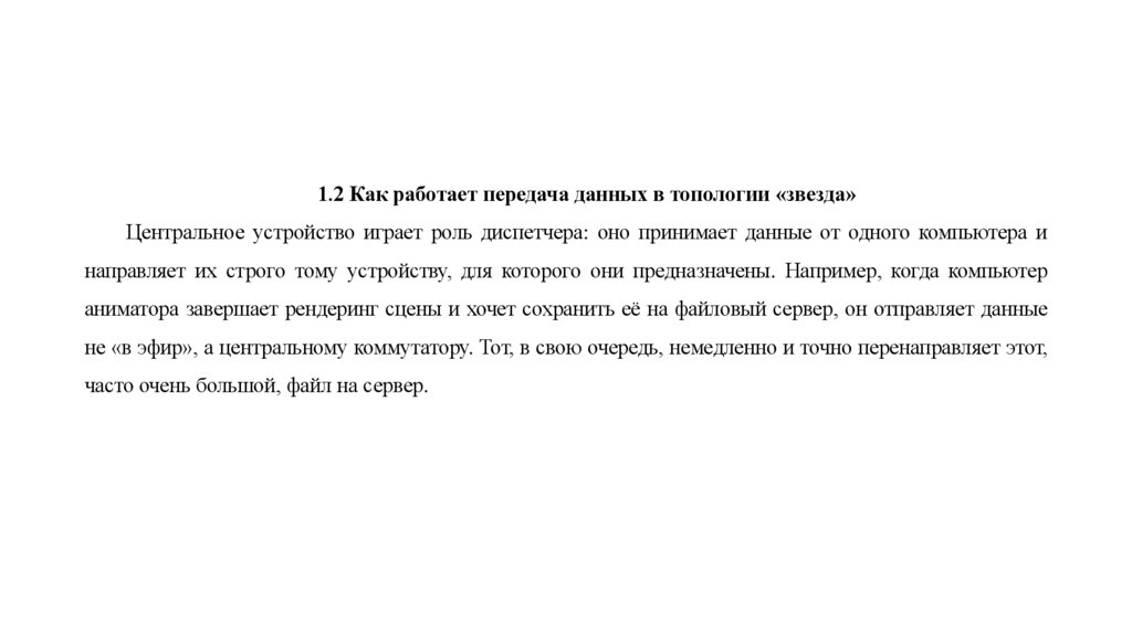 1.2 Как работает передача данных в топологии «звезда»Центральное устройство играет роль диспетчера: оно принимает данные от одного компьютера и