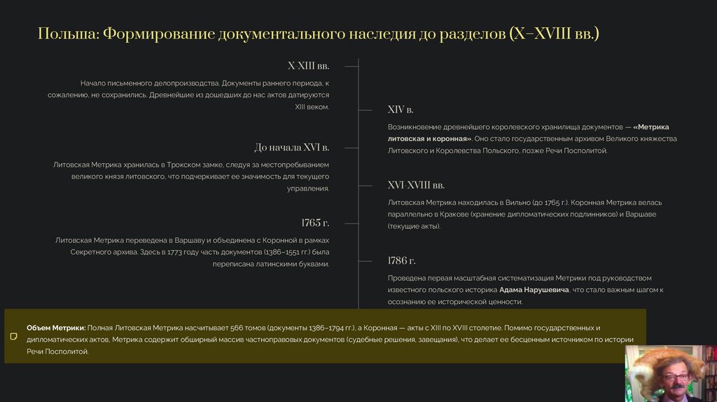 Объем Метрики: Полная Литовская Метрика насчитывает 566 томов (документы 1386–1794 гг.), а Коронная — акты с XIII по XVIII столетие. Помимо государственных и