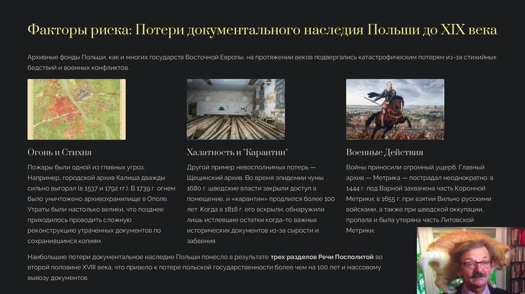 Факторы риска: Потери документального наследия Польши до XIX векаАрхивные фонды Польши, как и многих государств Восточной Европы, на протяжении веков подвергались катастрофическим потерям из-за стихийных
