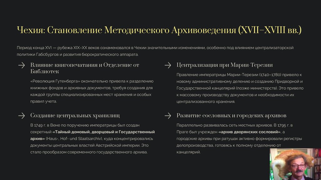 Чехия: Становление Методического Архивоведения (XVII–XVIII вв.)Период конца XVI — рубежа XIX–XX веков ознаменовался в Чехии значительными изменениями, особенно под влиянием централизаторской
