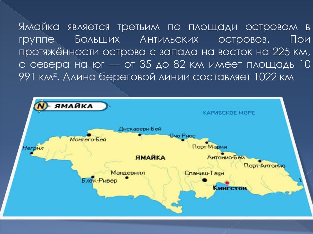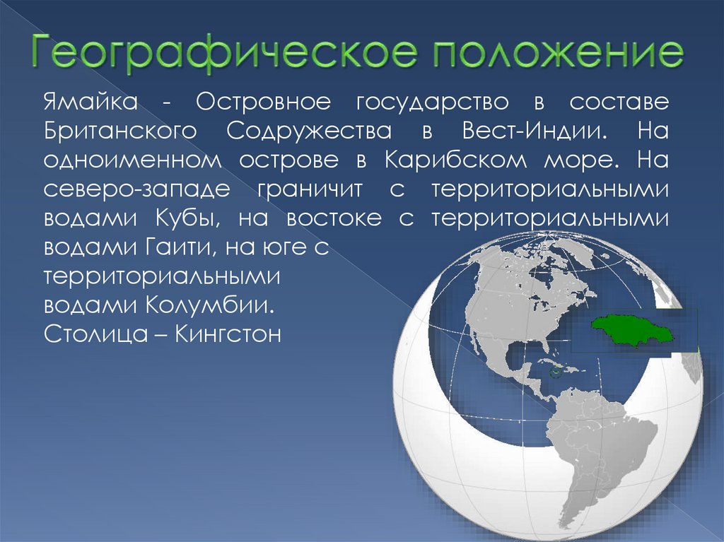 Ямайка - Островное государство в составеБританского Содружества в Вест-Индии. На