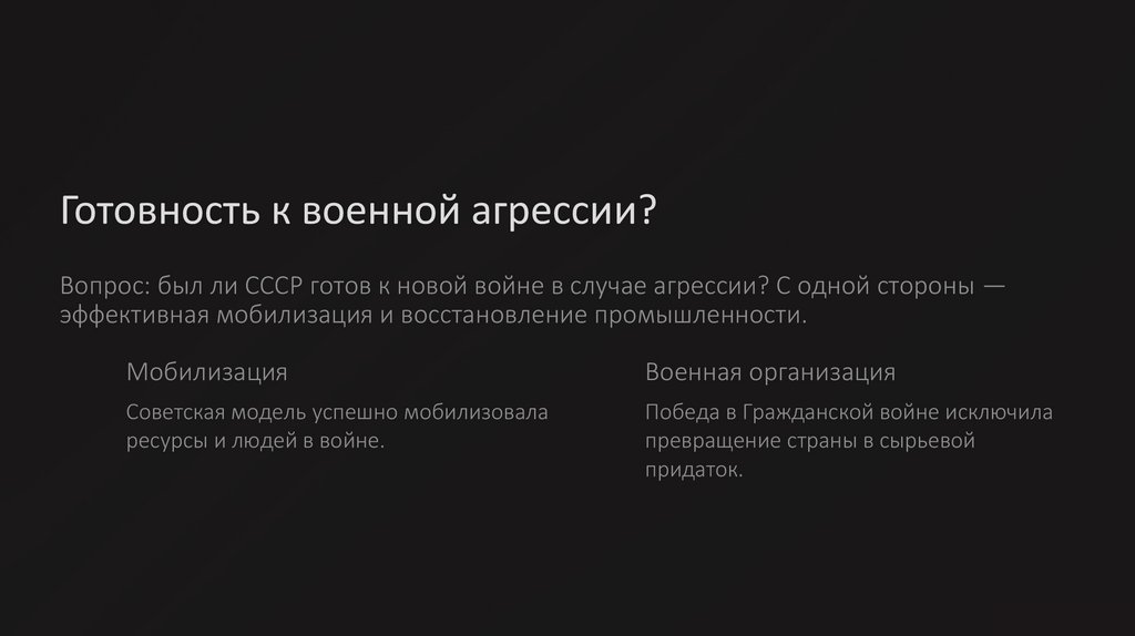 Готовность к военной агрессии?Вопрос: был ли СССР готов к новой войне в случае агрессии? С одной стороны —