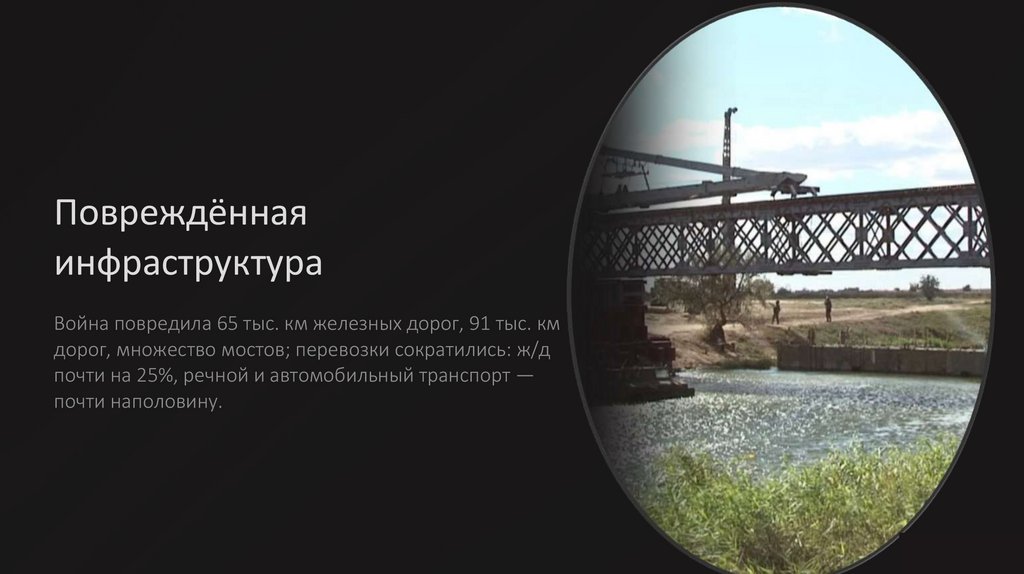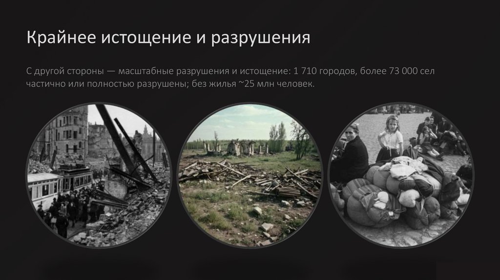 Крайнее истощение и разрушенияС другой стороны — масштабные разрушения и истощение: 1 710 городов, более 73 000 сел
