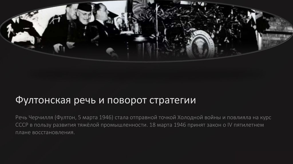 Фултонская речь и поворот стратегииРечь Черчилля (Фултон, 5 марта 1946) стала отправной точкой Холодной войны и повлияла на курс