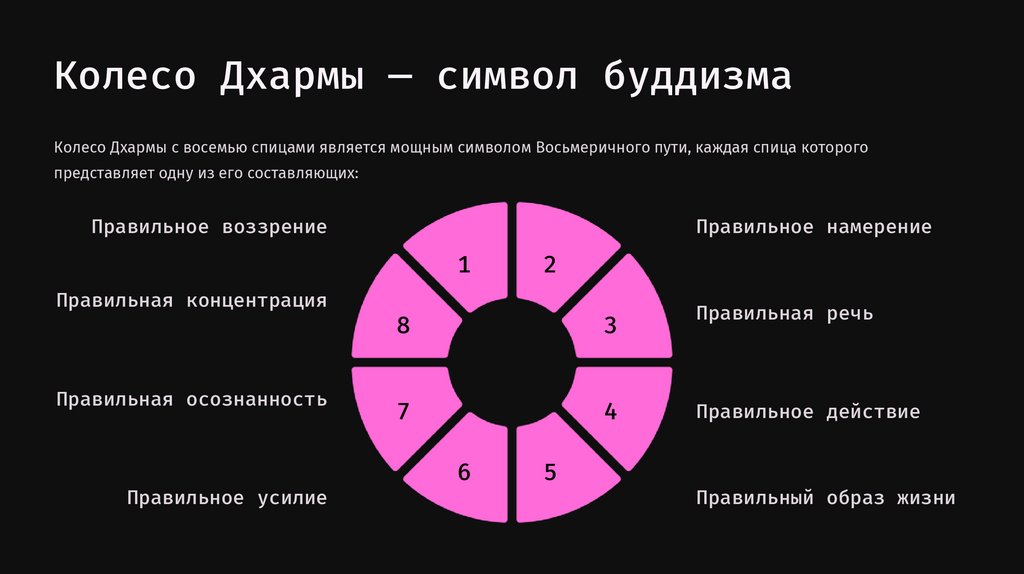 Колесо Дхармы — символ буддизмаКолесо Дхармы с восемью спицами является мощным символом Восьмеричного пути, каждая спица которого
