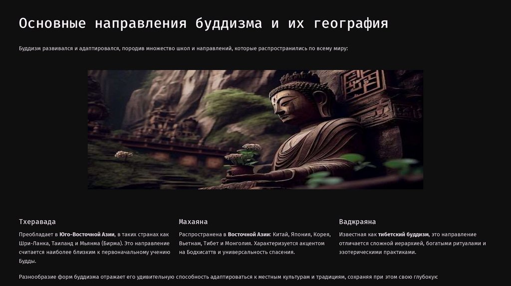 Основные направления буддизма и их географияБуддизм развивался и адаптировался, породив множество школ и направлений, которые распространились по всему миру: