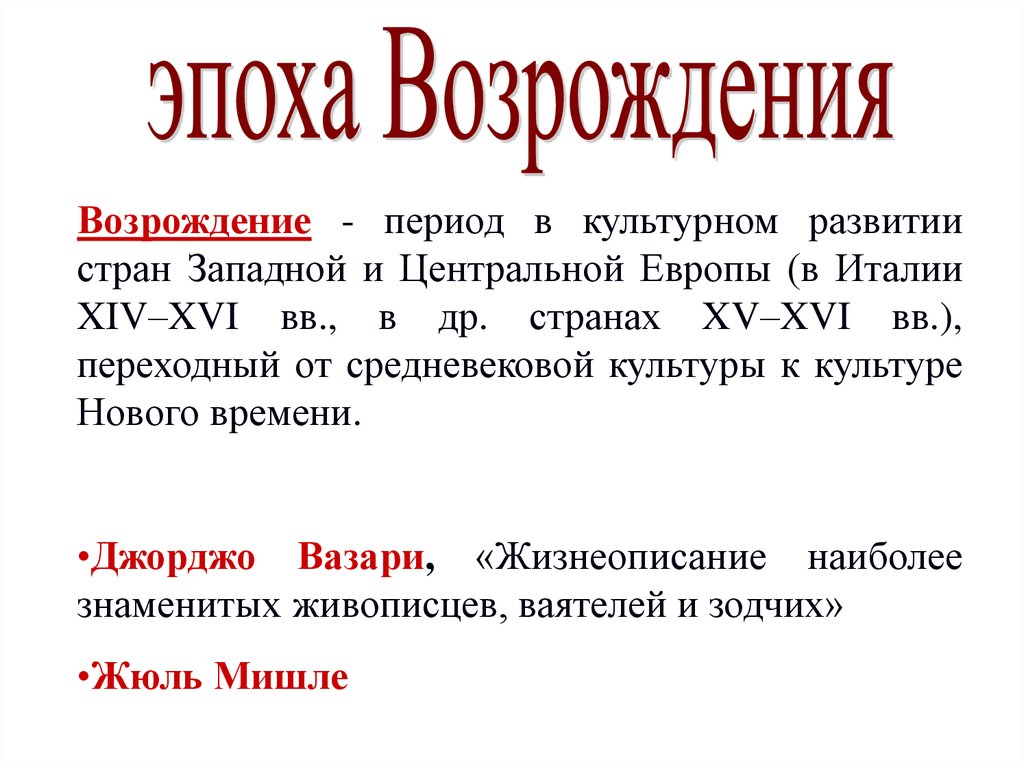 Возрождение - период в культурном развитиистран Западной и Центральной Европы (в Италии