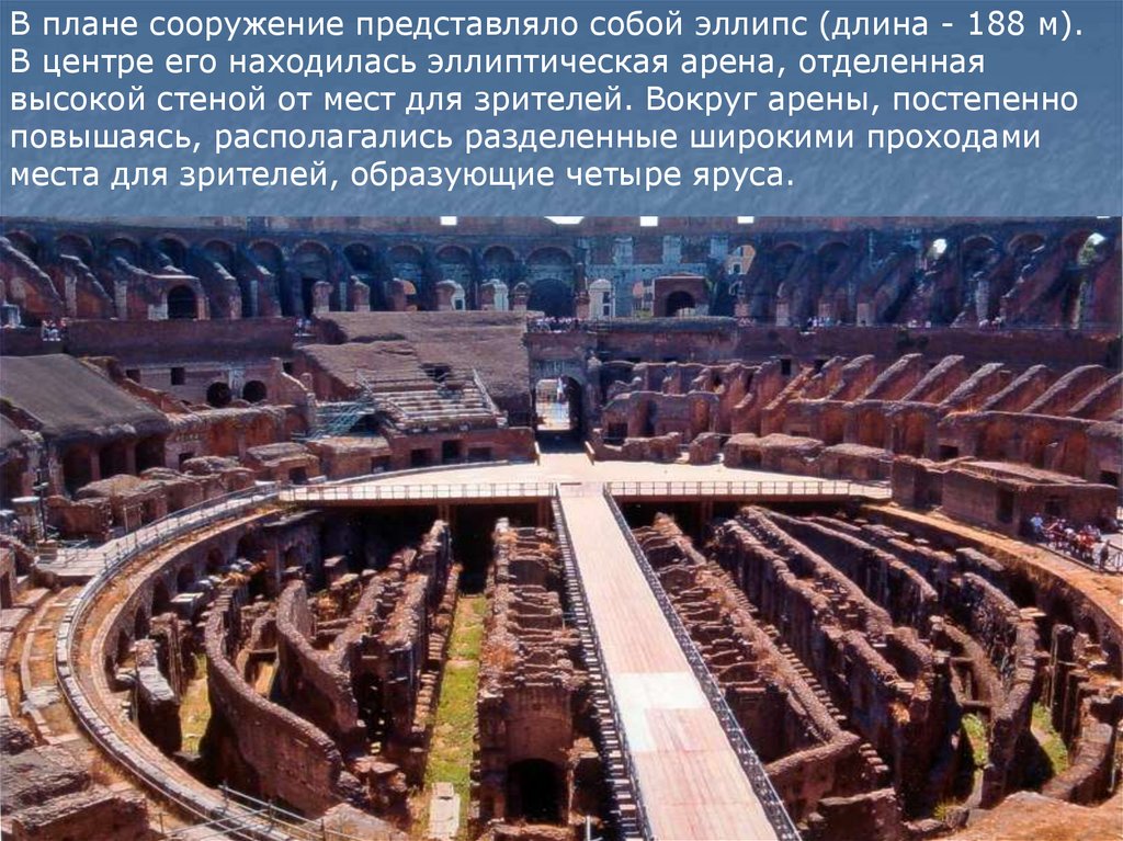 В плане сооружение представляло собой эллипс (длина - 188 м).В центре его находилась эллиптическая арена, отделенная