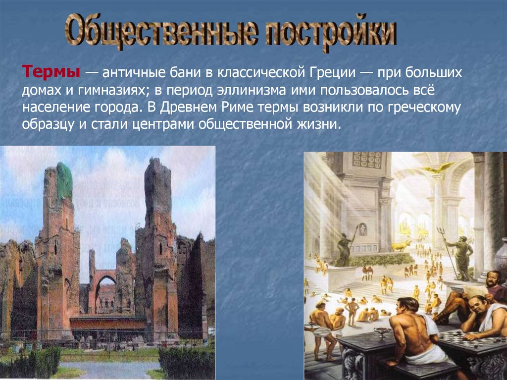 Термы — античные бани в классической Греции — при большихдомах и гимназиях; в период эллинизма ими пользовалось всё