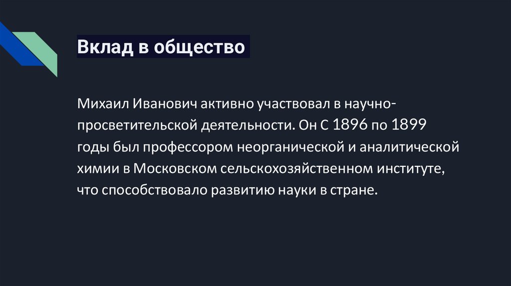 Вклад в обществоМихаил Иванович активно участвовал в научнопросветительской деятельности. Он С 1896 по 1899