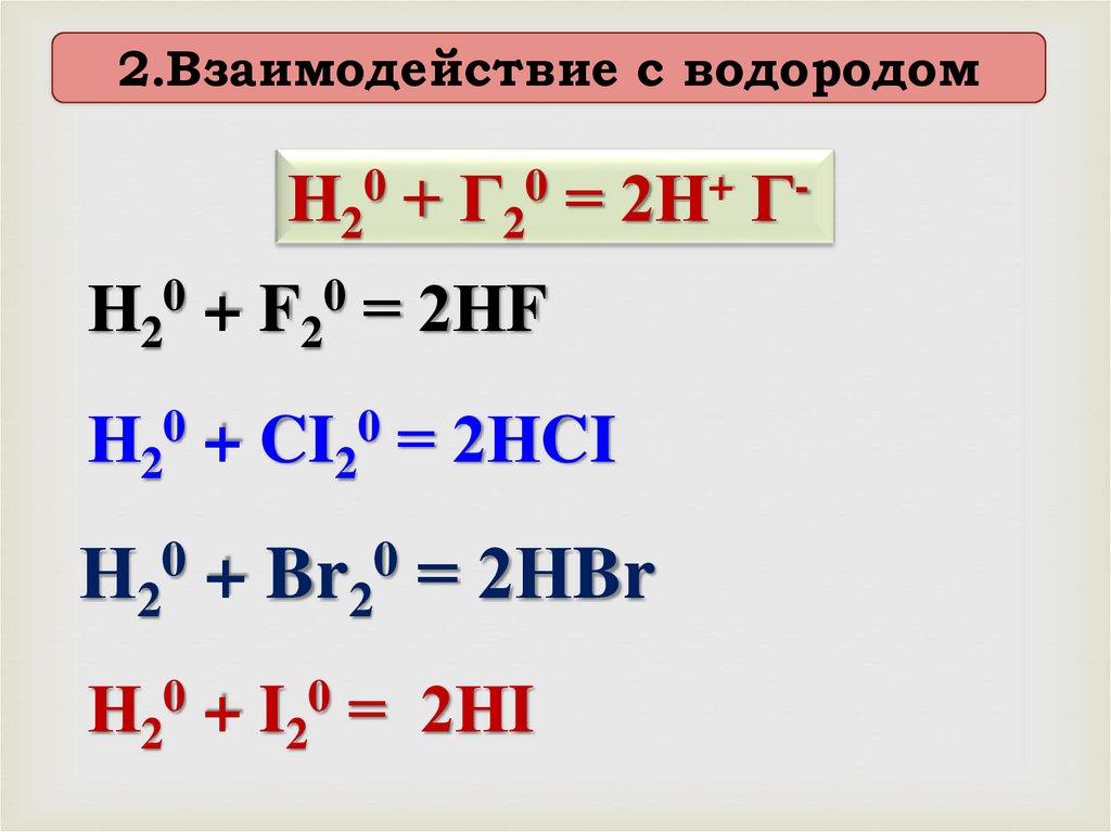 2.Взаимодействие с водородомН20 + Г20 = 2Н+ Г-