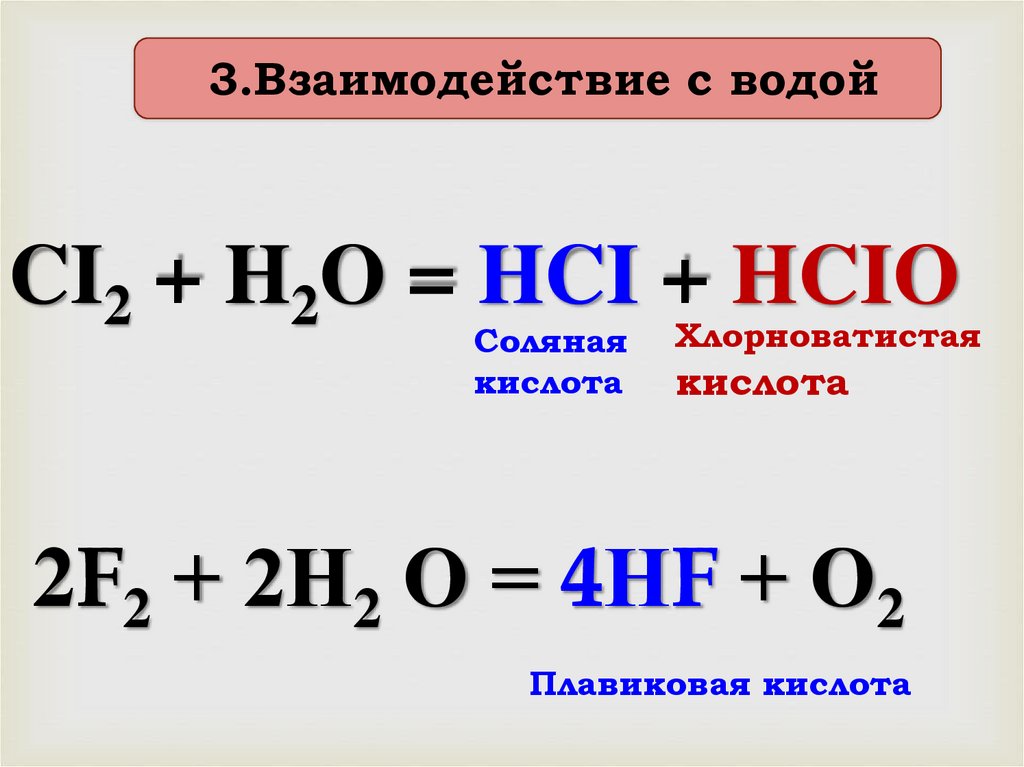 3.Взаимодействие с водойCI2 + H2O = HCI + HCIO