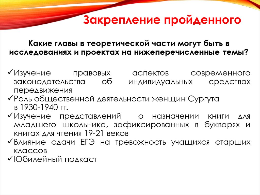 Закрепление пройденногоКакие главы в теоретической части могут быть в