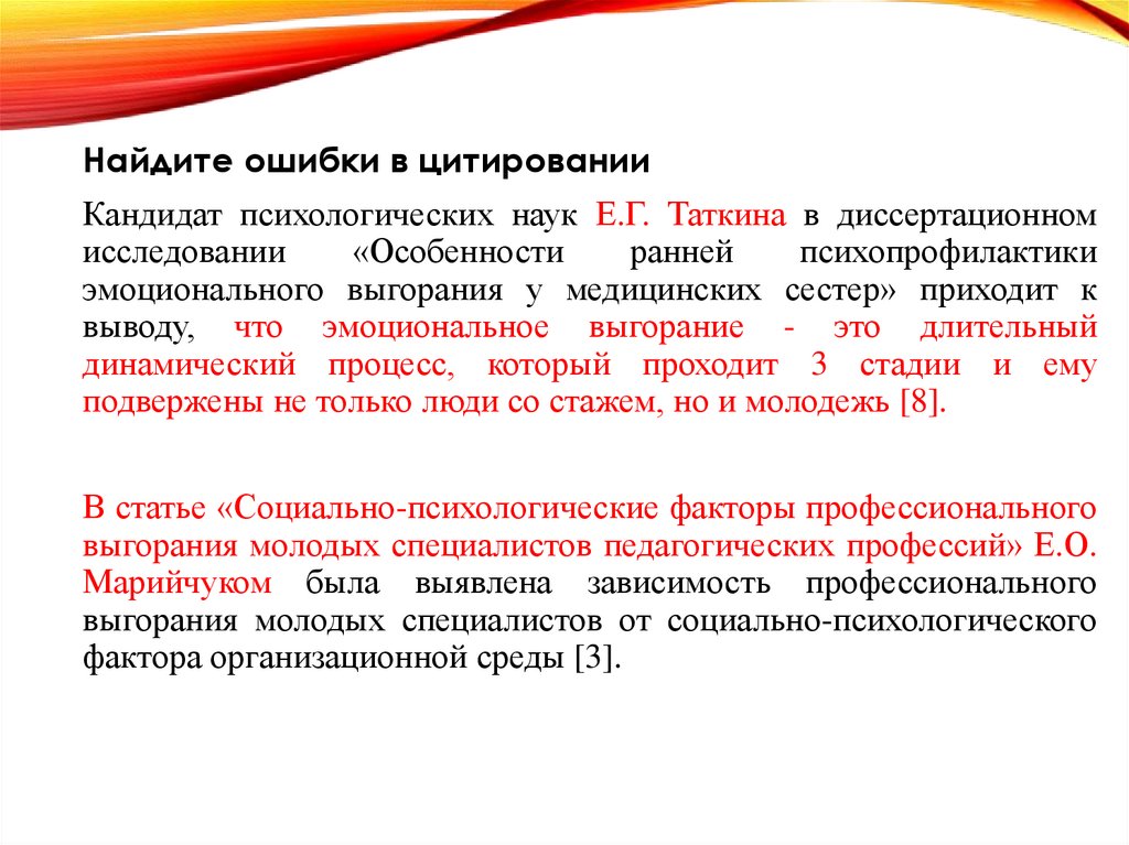 Найдите ошибки в цитированииКандидат психологических наук Е.Г. Таткина в диссертационном