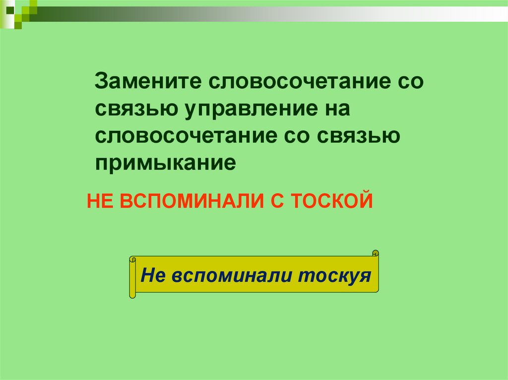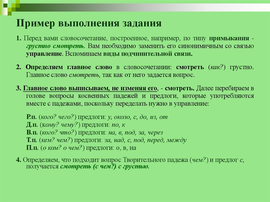 Пример выполнения задания1. Перед вами словосочетание, построенное, например, по типу примыкания грустно смотреть. Вам необходимо заменить его синонимичным со связью