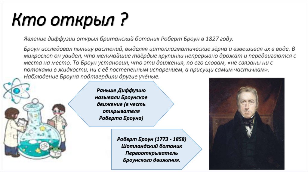 Кто открыл ?Явление диффузии открыл британский ботаник Роберт Броун в 1827 году.