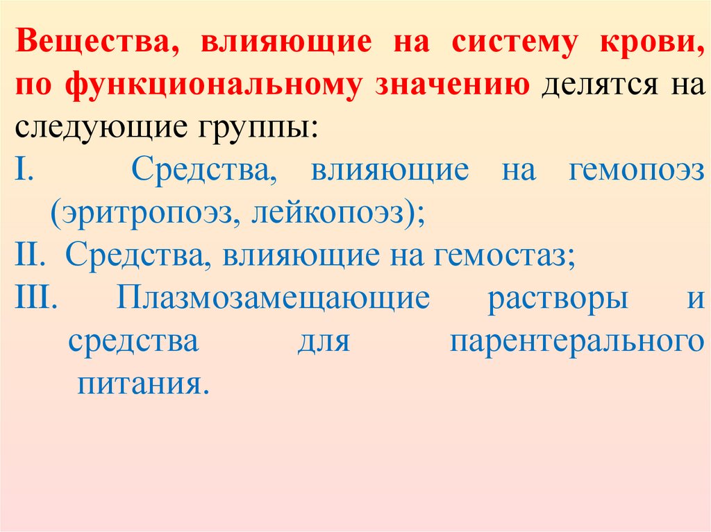 Вещества, влияющие на систему крови,по функциональному значению делятся на