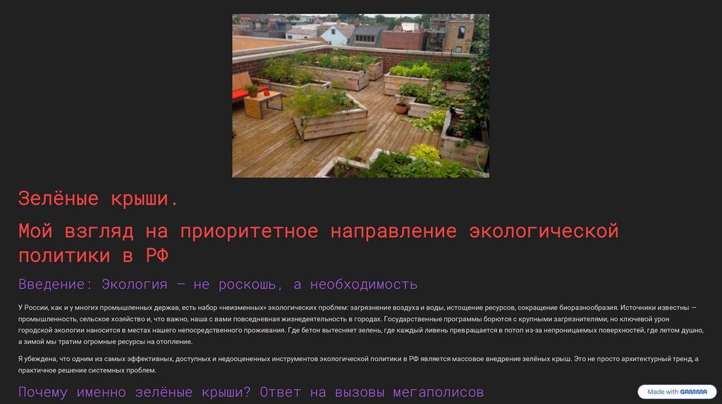 Я убеждена, что одним из самых эффективных, доступных и недооцененных инструментов экологической политики в РФ является массовое внедрение зелёных крыш. Это не просто архитектурный тренд, а