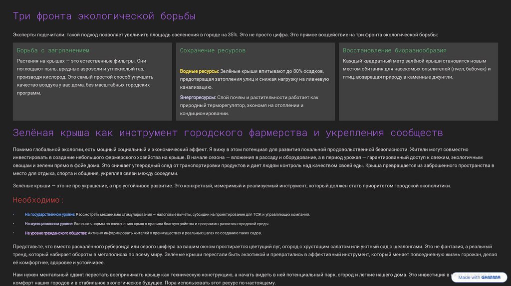 Нам нужен ментальный сдвиг: перестать воспринимать крышу как техническую конструкцию, а начать видеть в ней потенциальный парк, огород и легкие нашего дома. Это инвестиция в наше здоровье, в