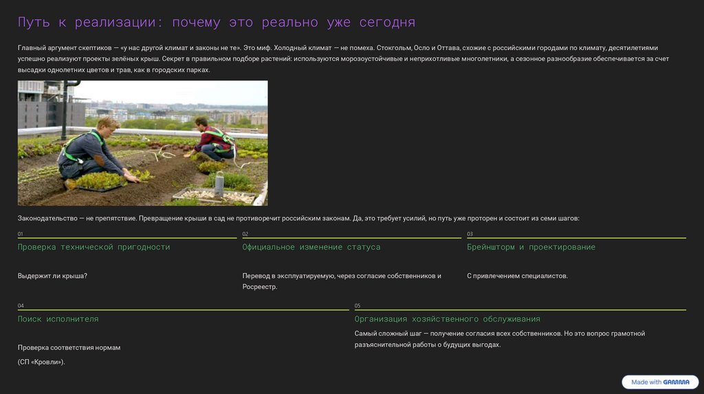 Законодательство — не препятствие. Превращение крыши в сад не противоречит российским законам. Да, это требует усилий, но путь уже проторен и состоит из семи шагов: